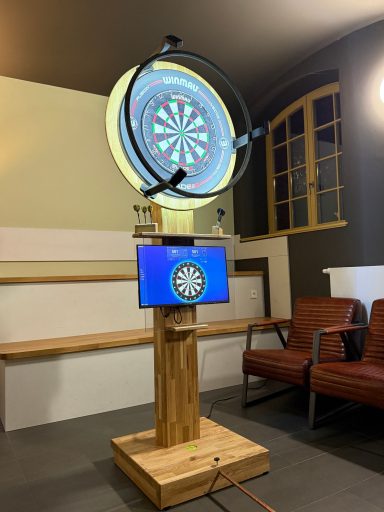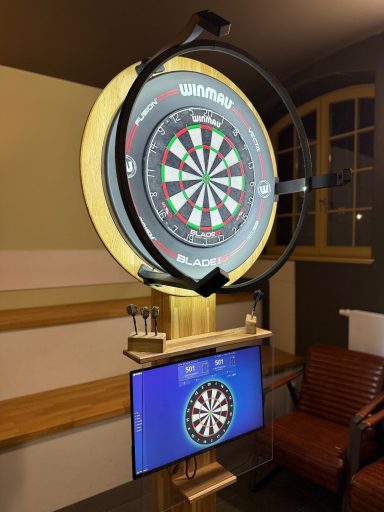 In rustikaler Eiche ist dieses Dartboard nach offiziellen Regeln spielbar. Mit Halterung für Dartpfeile, Abstandshalter & Libelle zum Ausrichten.