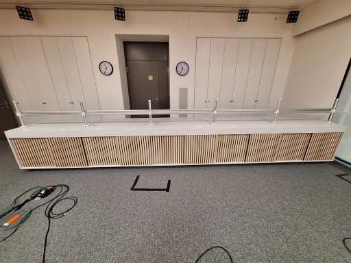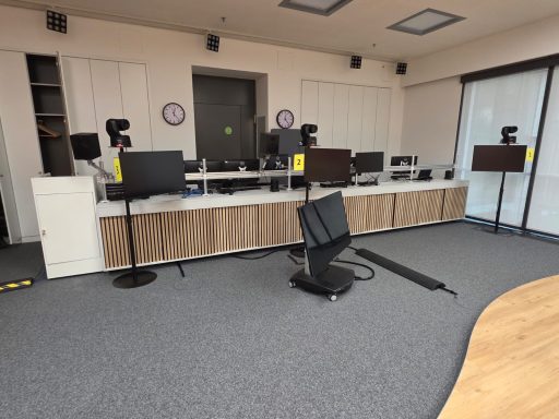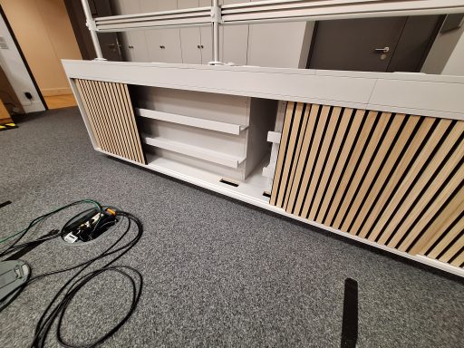 Dieses 6 Meter lange Spanplattenmöbel in Lichtgrau, bietet ein optimiertes Kabelmanagement. Mit Akustikpanelen als Schiebetüren, fügt sich Montomery nahtlos in dieses Fernsehstudio ein.