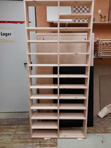 Dieses massive CD Regal aus Kiefer ist hier mit klassischen durchgestemmten Zapfen & Schwalbenzinkung, hängt an Keilleisten und ist ein wunderbarer Blickfang.