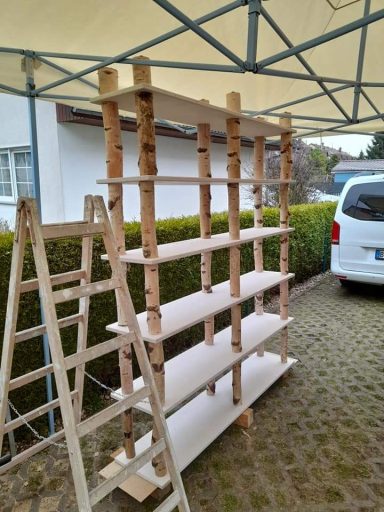 Birke-Multiplex trifft auf massive Birkenstämme. Dieses natürlich anmutende Regal wurde für einen Massagesalon angefertigt.