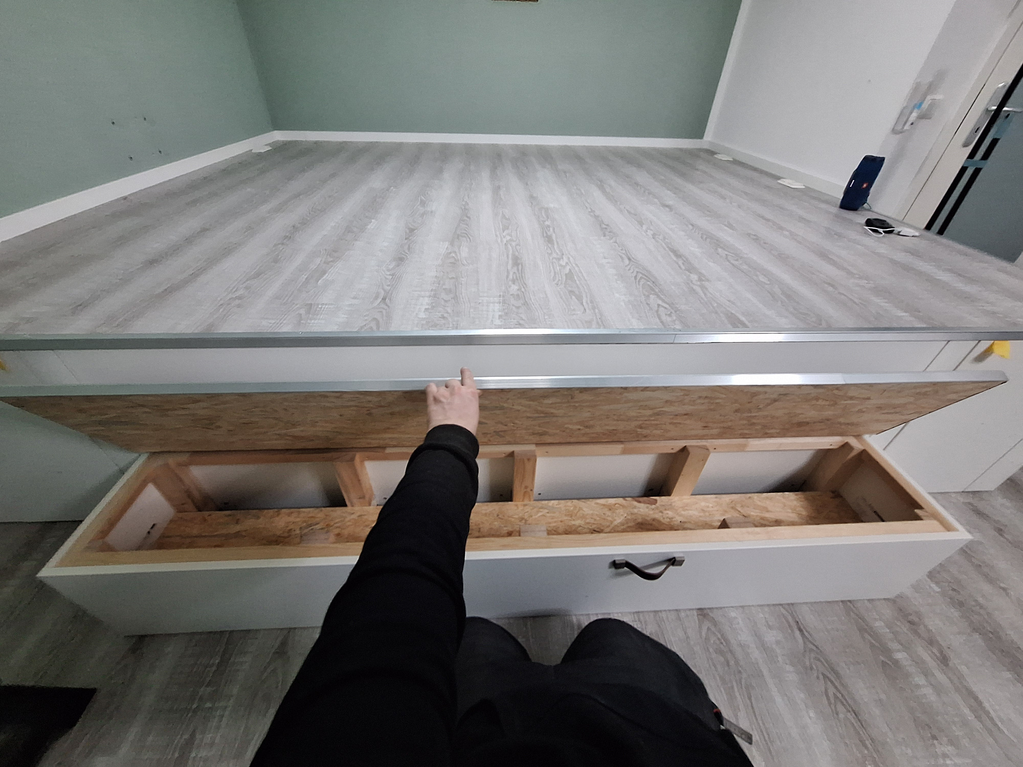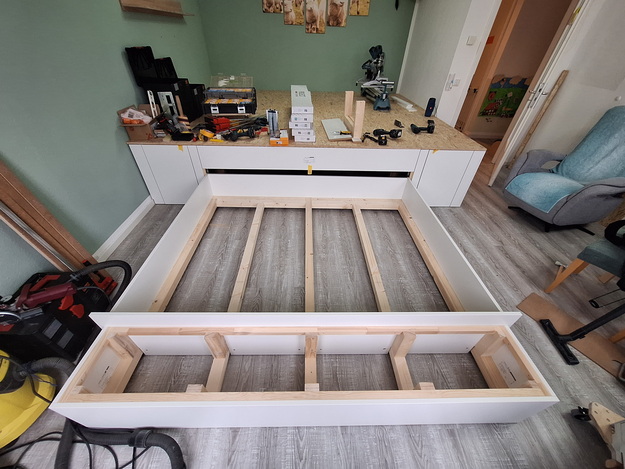 Ein ausziehbarer Bettkasten unter der Wohninsel im Wohnzimmer bietet 2 Meter x 1,6 Meter Liegefläche & zusätzlichen Stauraum für die junge wachsende Familie.