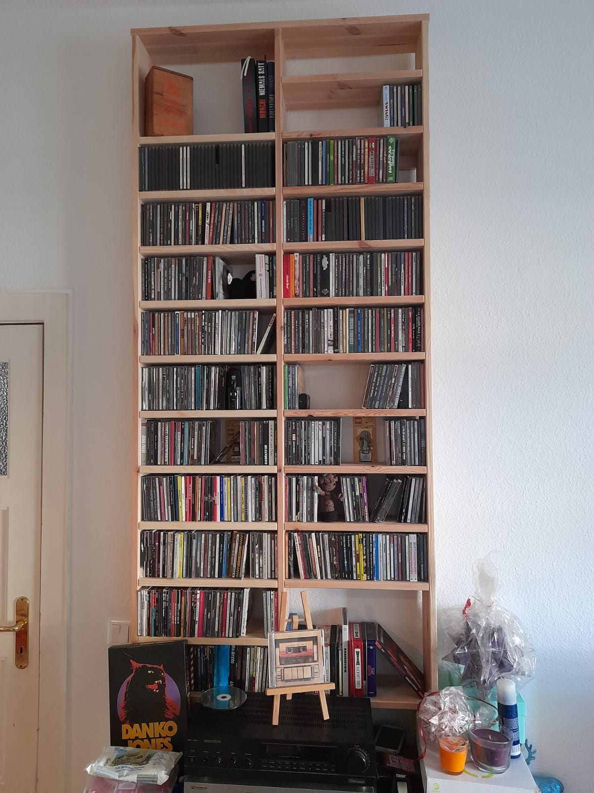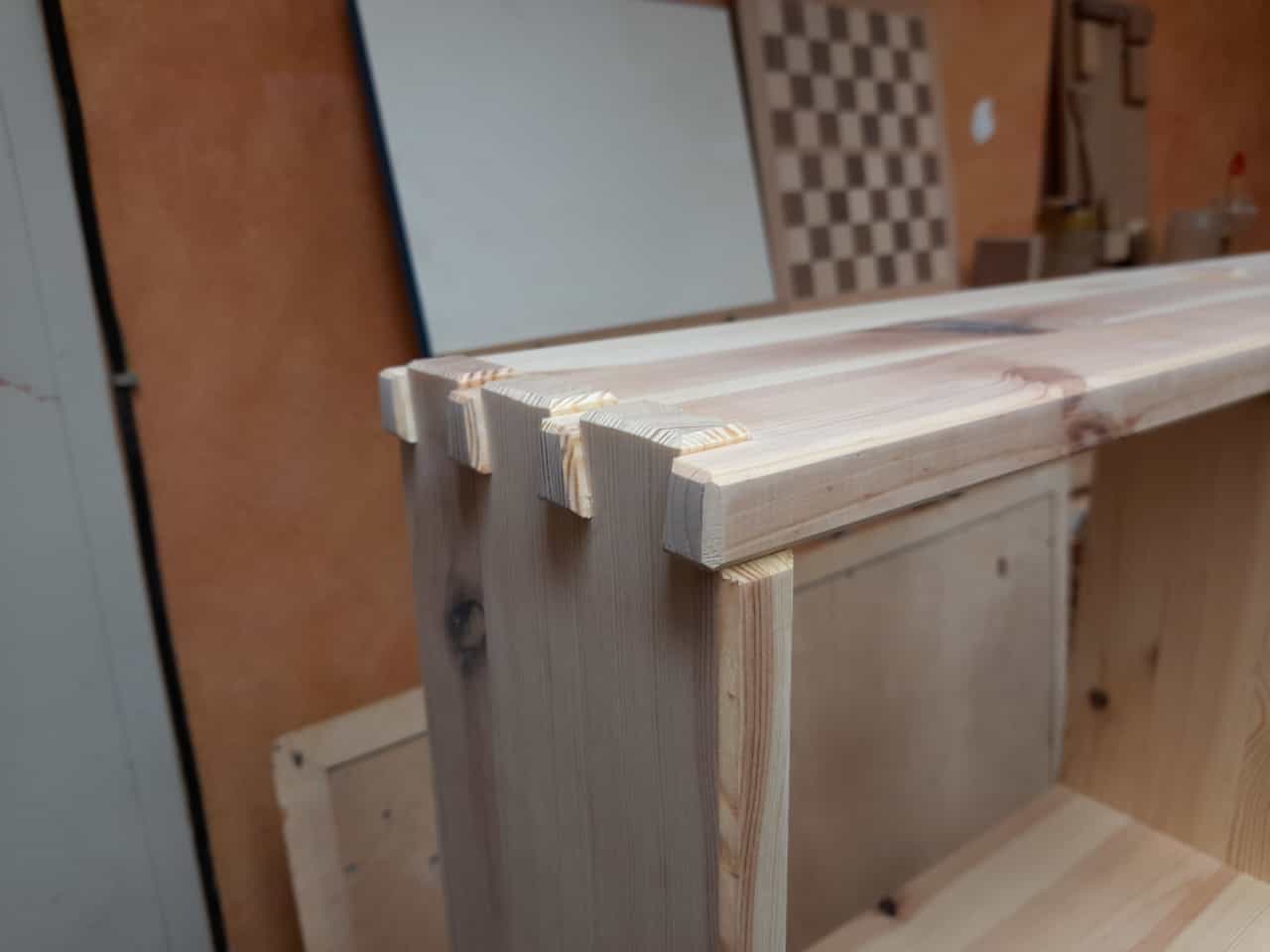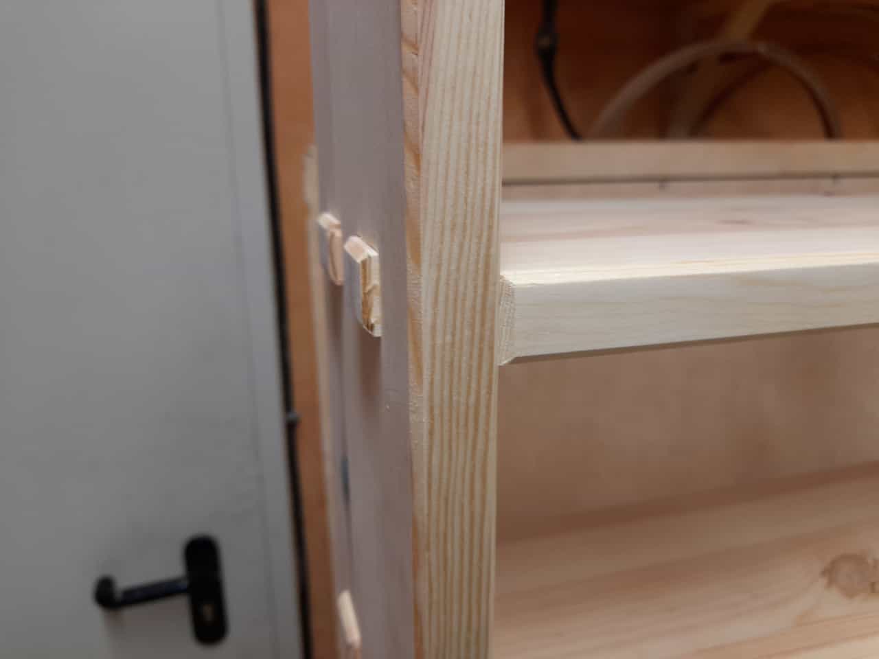Dieses massive CD Regal aus Kiefer ist hier mit klassischen durchgestemmten Zapfen & Schwalbenzinkung, hängt an Keilleisten und ist ein wunderbarer Blickfang.