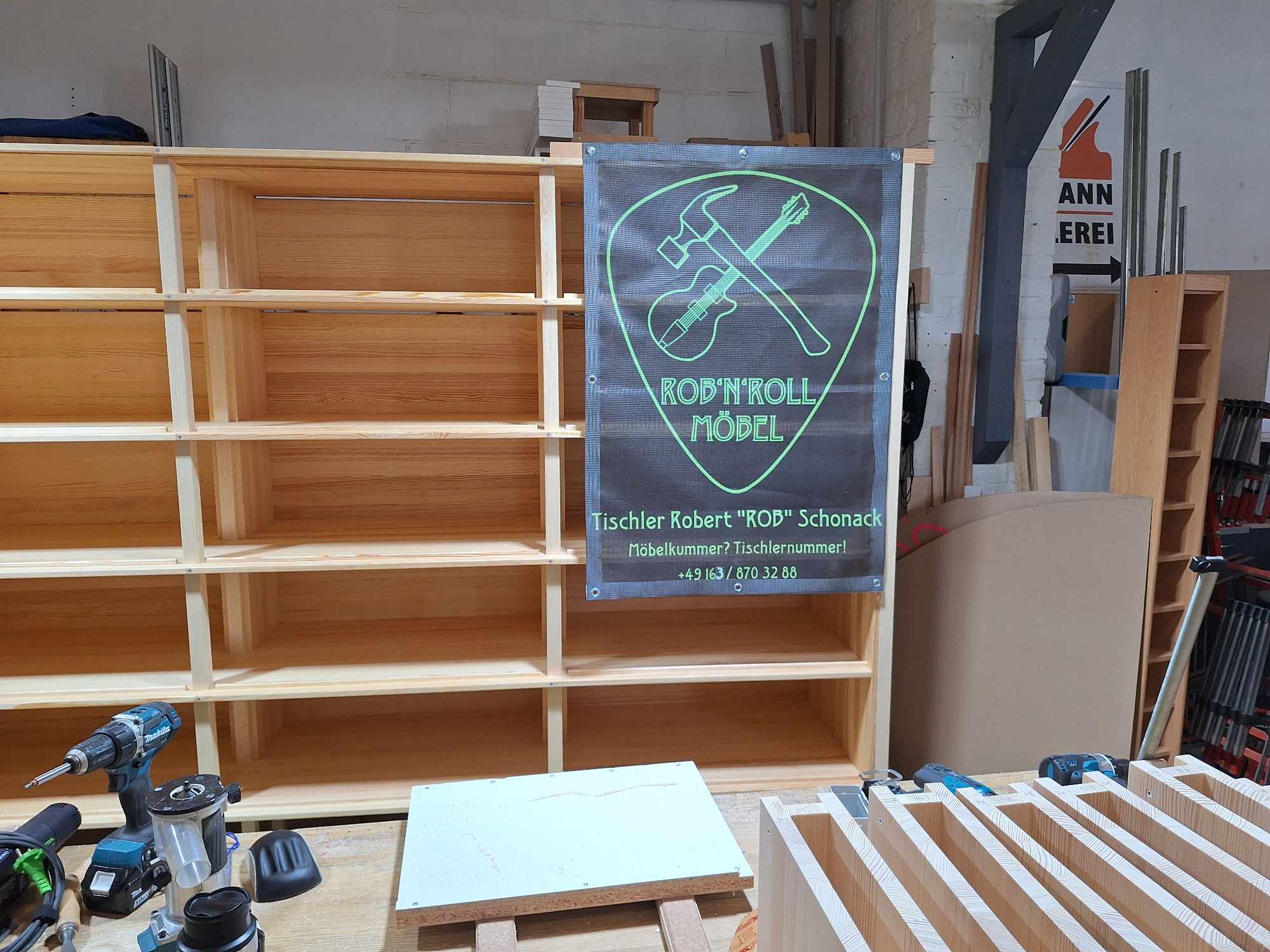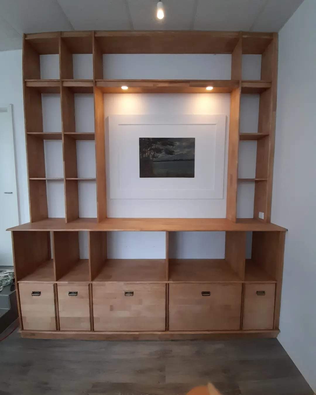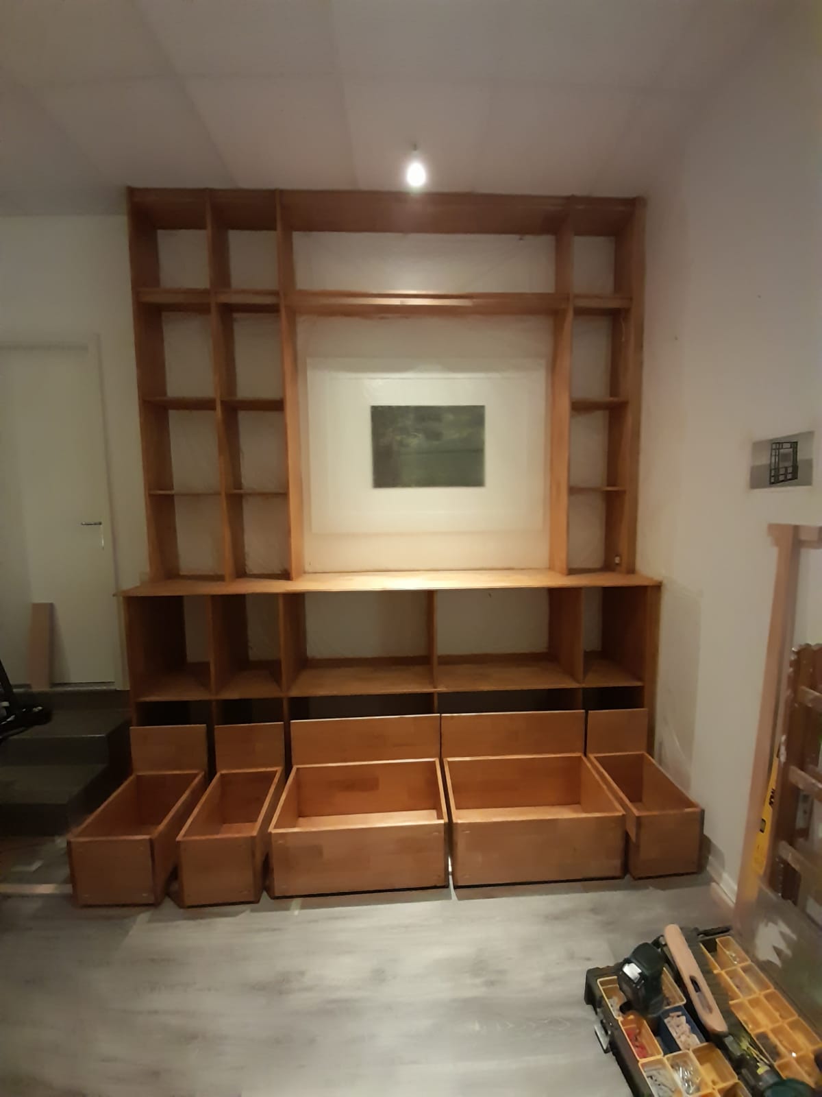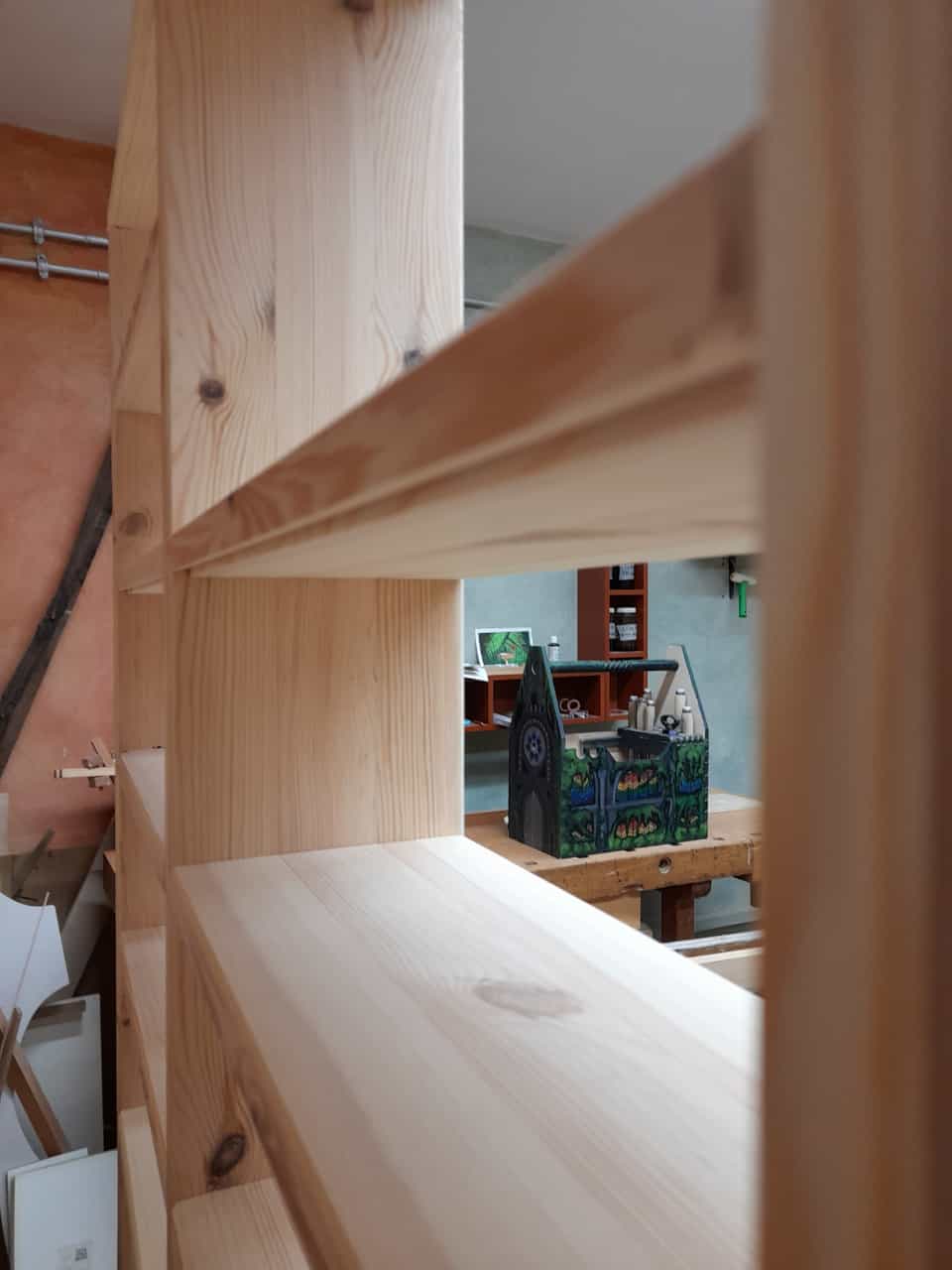 Dieses massive CD Regal aus Kiefer ist hier mit klassischen durchgestemmten Zapfen & Schwalbenzinkung, hängt an Keilleisten und ist ein wunderbarer Blickfang.