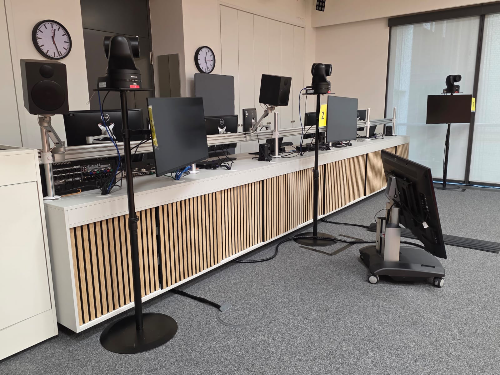 Dieses 6 Meter lange Spanplattenmöbel in Lichtgrau, bietet ein optimiertes Kabelmanagement. Mit Akustikpanelen als Schiebetüren, fügt sich Montomery nahtlos in dieses Fernsehstudio ein.