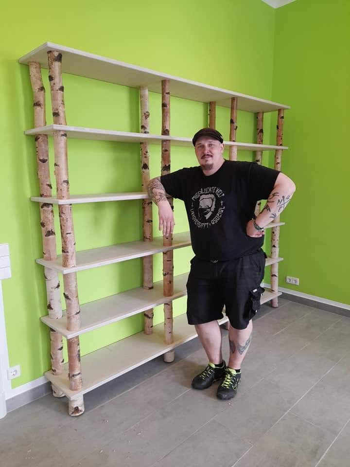 Birke-Multiplex trifft auf massive Birkenstämme. Dieses natürlich anmutende Regal wurde für einen Massagesalon angefertigt.