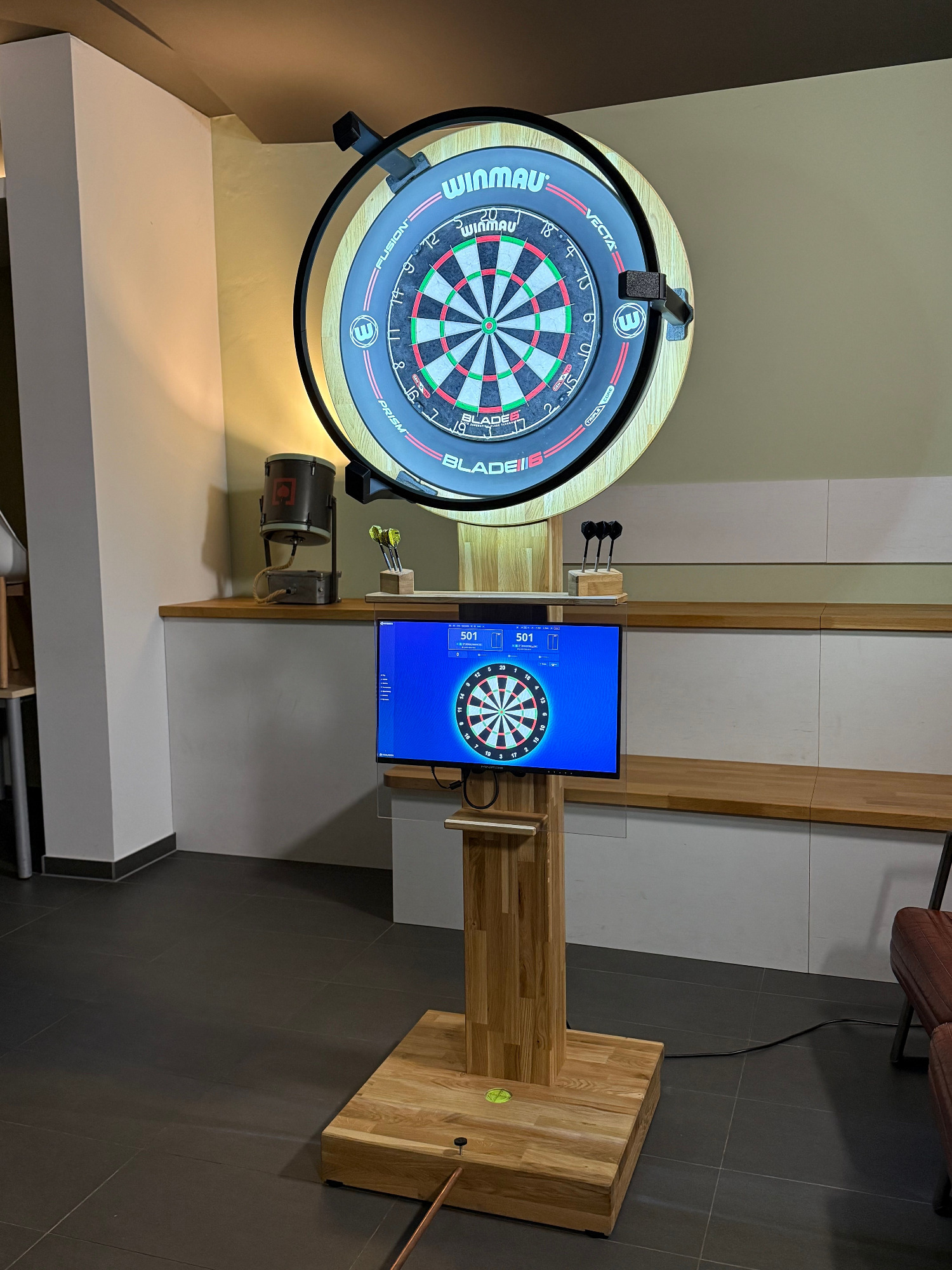 In rustikaler Eiche ist dieses Dartboard nach offiziellen Regeln spielbar. Mit Halterung für Dartpfeile, Abstandshalter & Libelle zum Ausrichten.